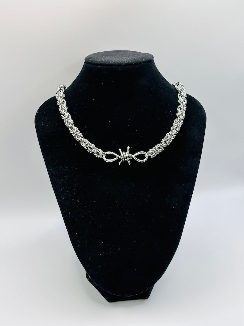 Add this barbed wire-inspired chainmail necklace to your collection for a fierce, standout look!