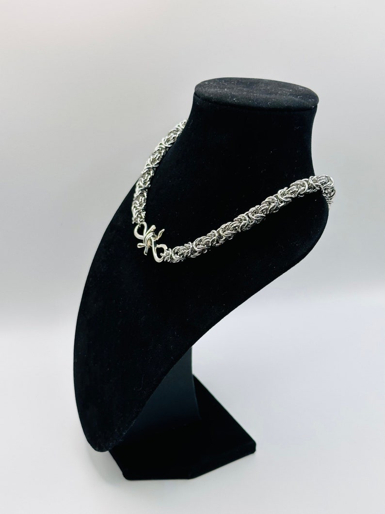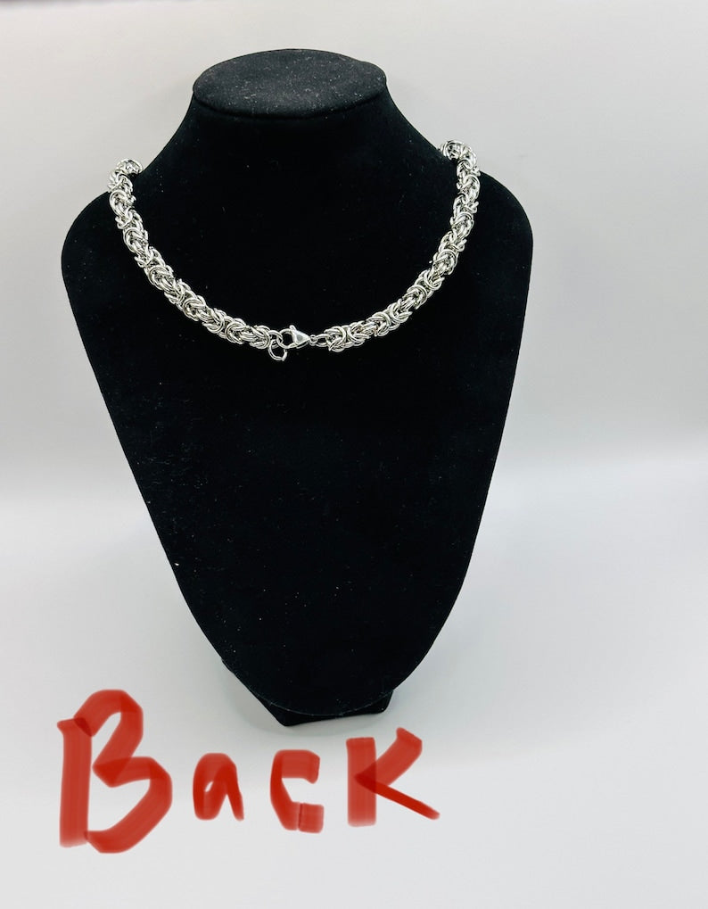 Make a bold fashion statement with this handcrafted Byzantine chainmail necklace, expertly designed using 8mm solid stainless steel jump rings for unmatched durability and style. Featuring a barbed wire-inspired pattern with brass connectors for a striking contrast, this edgy necklace is the perfect blend of craftsmanship and attitude.