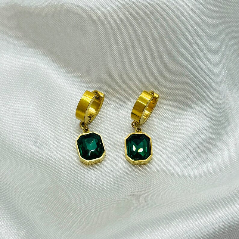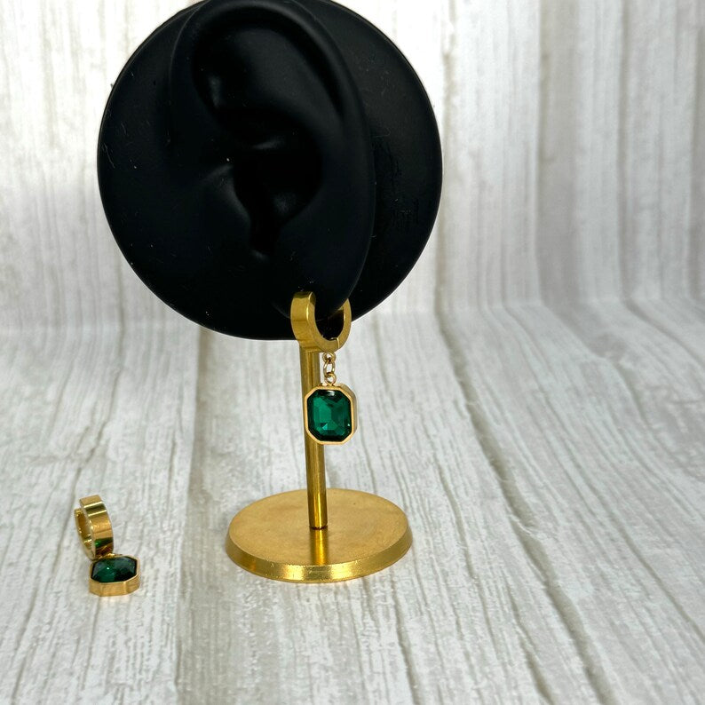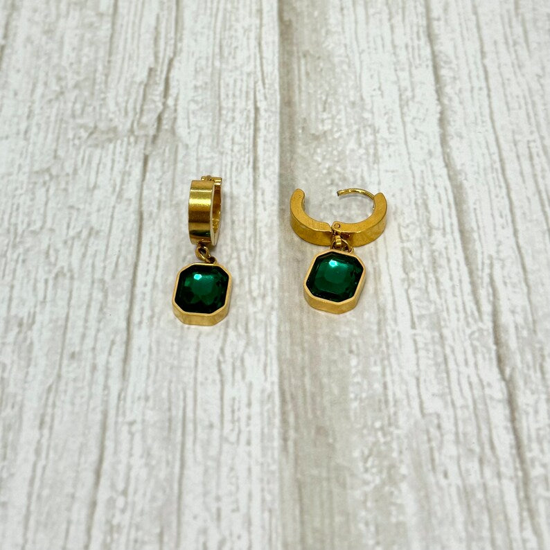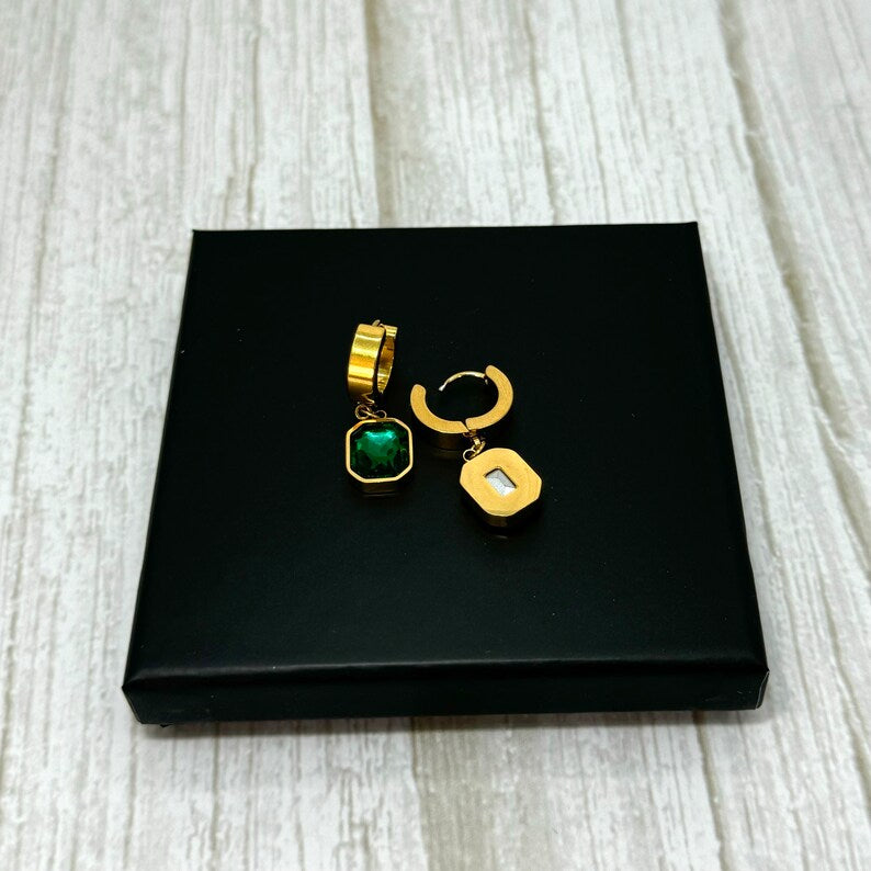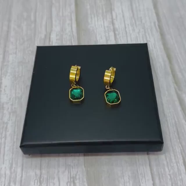 Add a touch of elegance to your jewellery collection with these stunning gold and emerald green hoop earrings. Crafted from high-quality stainless steel, these earrings feature a dazzling Cubic Zirconia (CZ) charm in a deep emerald green hue, making them a perfect statement piece for any occasion. Whether you're dressing up for a special event or adding a stylish accent to your everyday look, these earrings are designed to shine.
