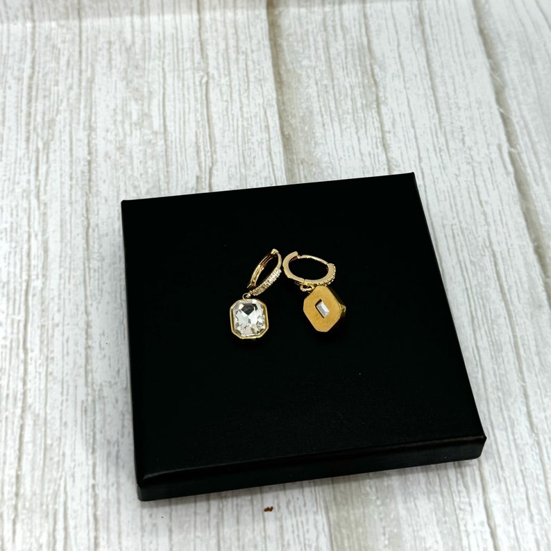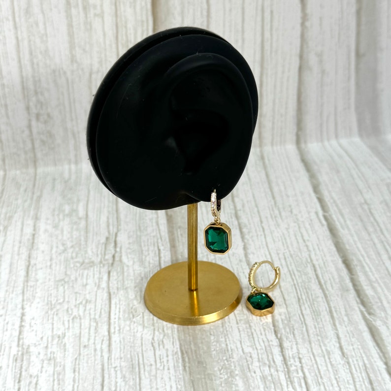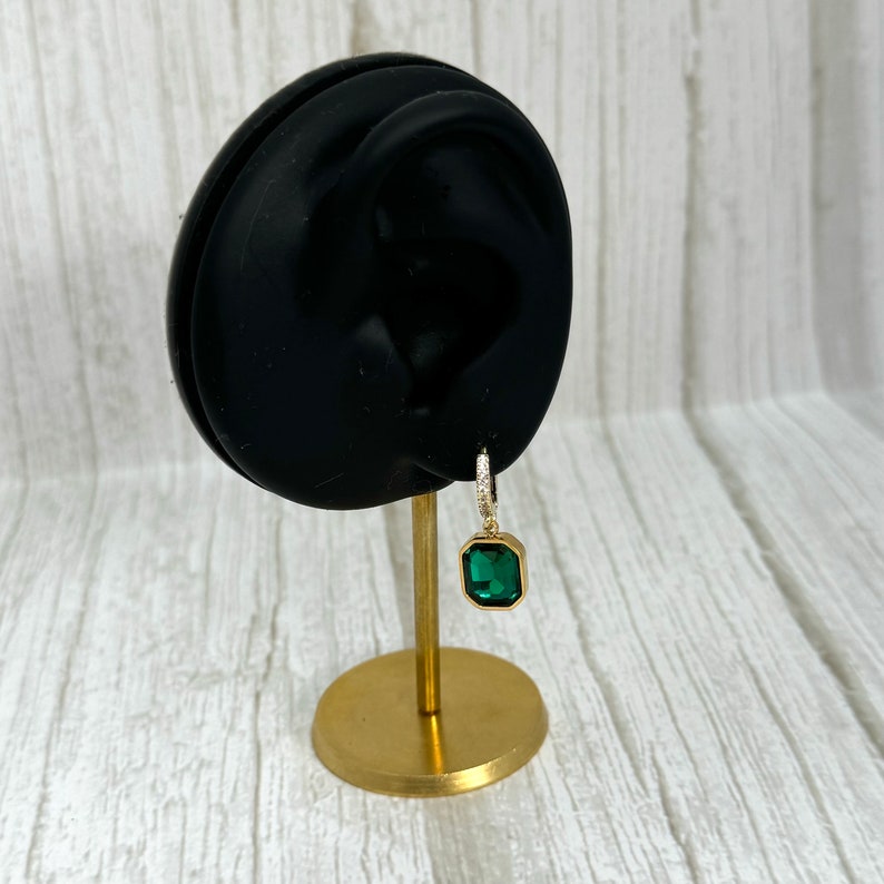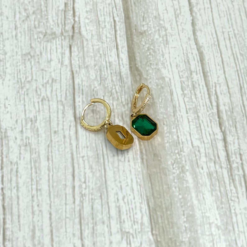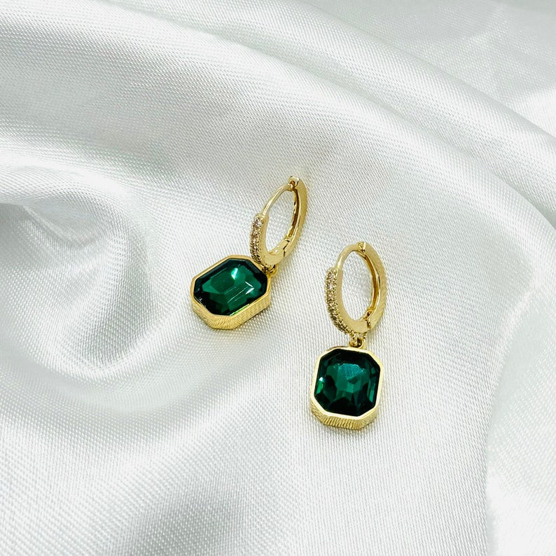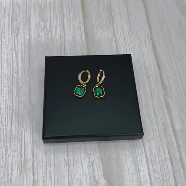 Add a touch of sophistication to your look with these stunning emerald green huggie hoop earrings. Designed to elevate any outfit, these earrings feature a gold-plated brass hoop adorned with a dazzling green square charm. Perfect for both everyday wear and special occasions, they make a timeless addition to your jewellery collection.