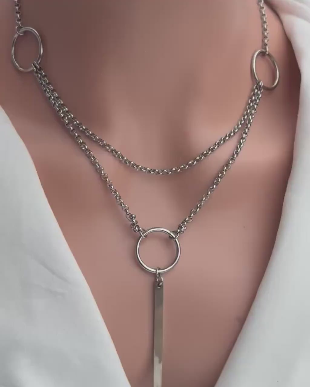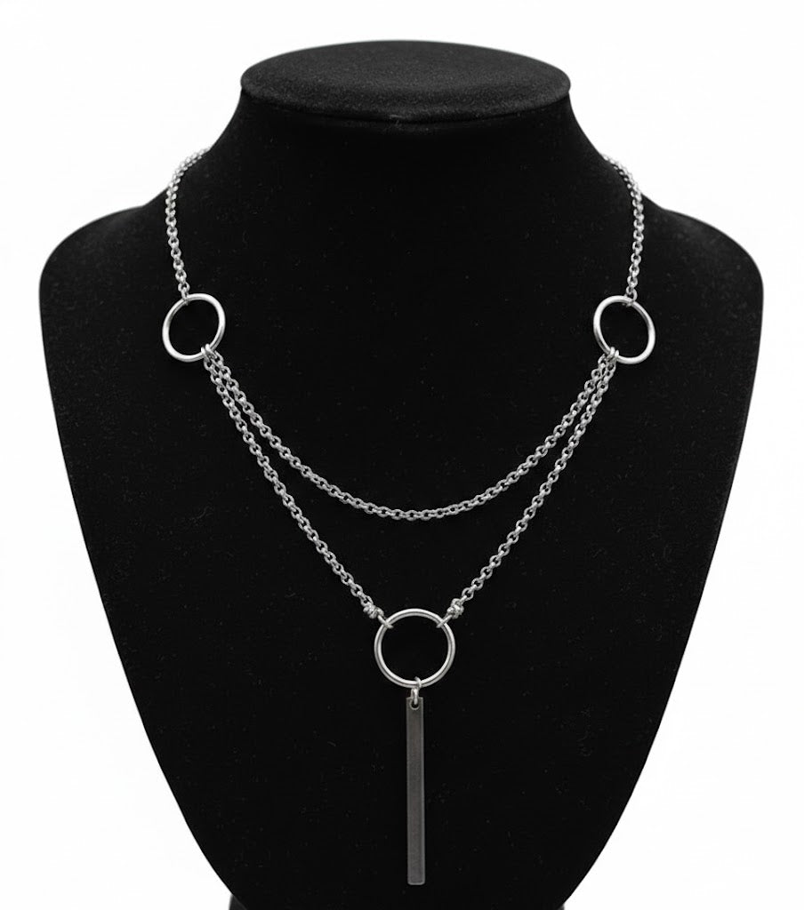 Elevate your look with this sleek silver double chain necklace, designed with a modern, minimalist edge. Featuring two fine chains connected by polished O-ring accents and finished with a vertical bar drop pendant, this piece blends contemporary style with subtle punk influence.