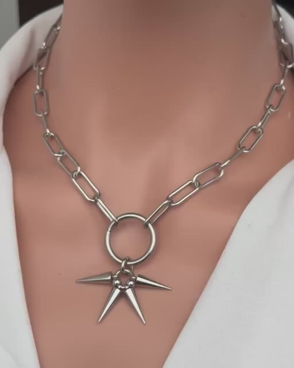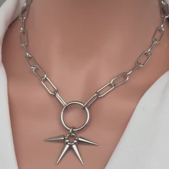 Command attention with this bold silver spike chain necklace, designed for unapologetic punk and goth styling. Featuring a chunky link chain, a central O-ring, and sharp spike pendant detailing, this piece delivers a powerful alternative aesthetic with modern edge.