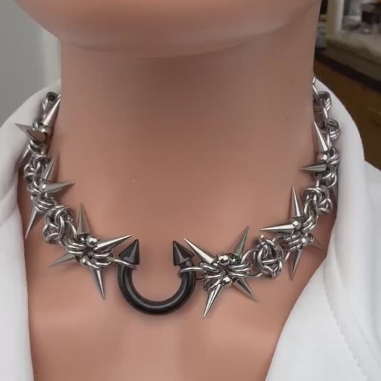 Command attention with a fusion of industrial edge and celestial aggression. Crafted for those who live on the fringes of convention, this Stainless Steel Spiked Star Choker features a high-polish finish that demands a second look. The design showcases intricate, interwoven chain links punctuated by sharp, multi-directional starburst spikes.
