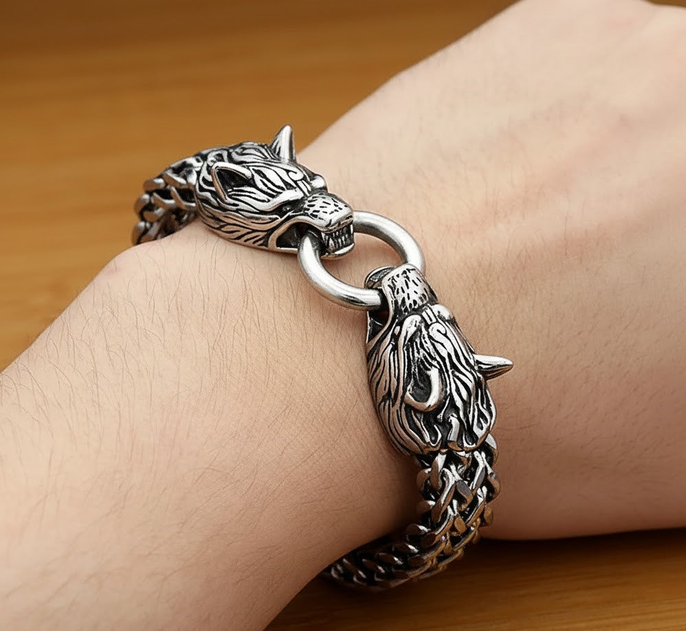 Make a bold statement with this powerful wolf head chain bracelet, designed to symbolise strength, loyalty, and resilience. Featuring intricately detailed wolf head clasps and a heavy, tightly woven chain, this piece delivers a rugged, masculine edge with premium craftsmanship.