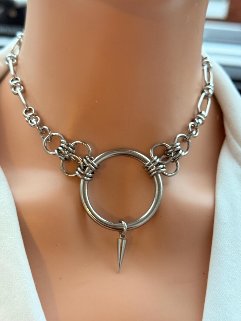 Bold Centrepiece: Features a substantial polished O-ring focal point with a single, sharp cone spike pendant.