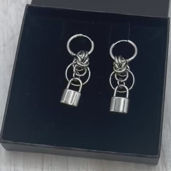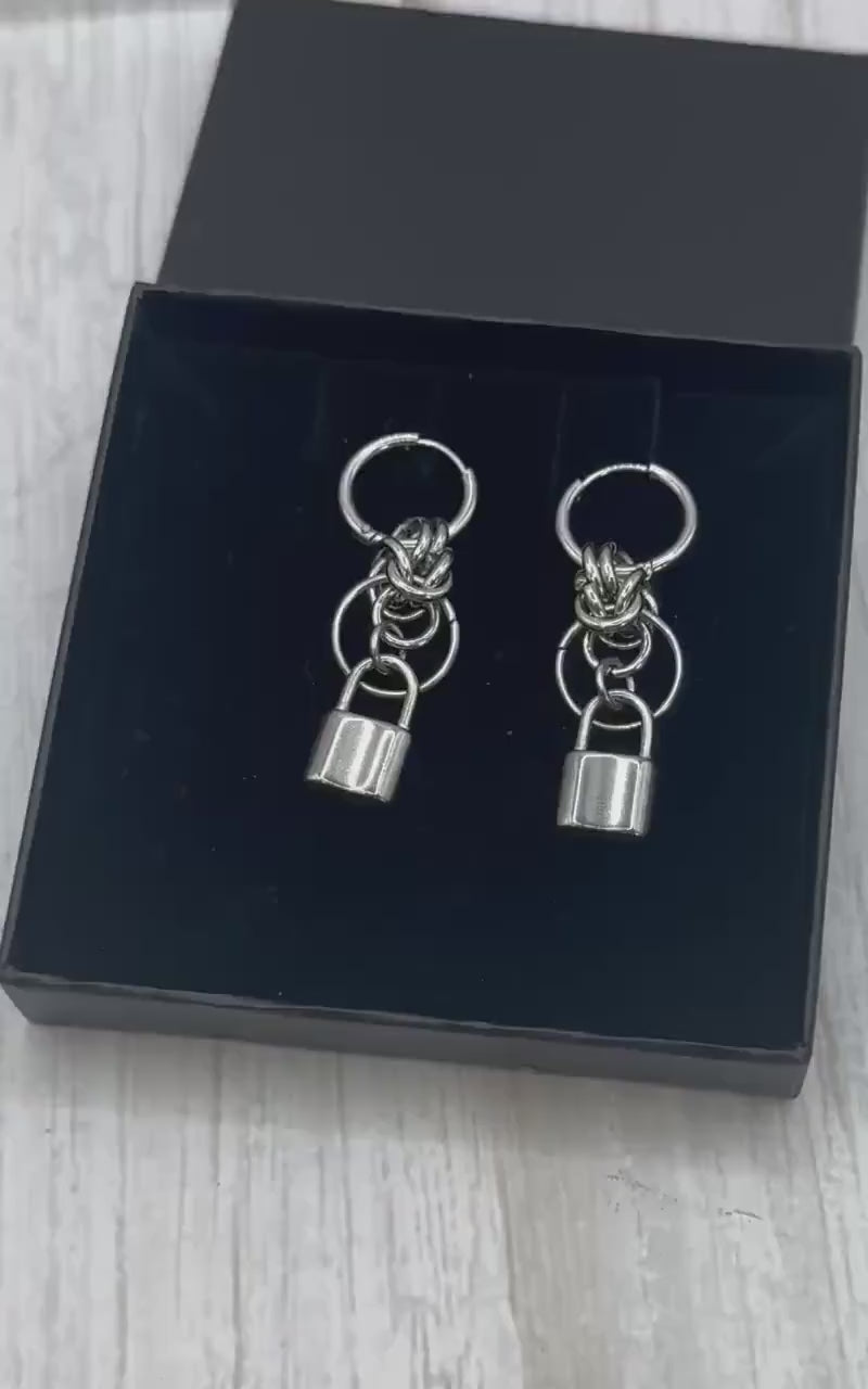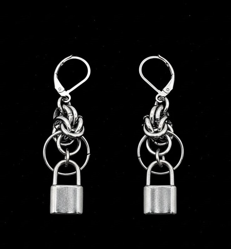 Elevate your alternative aesthetic with these Stainless Steel Padlock Chainmaille Drop Earrings. Combining industrial hardware with artisan craftsmanship, these earrings feature a complex hand-woven chainmaille knot that transitions into a bold, miniature padlock charm.